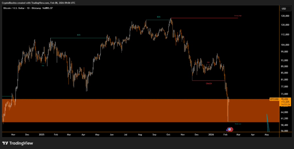 Bitcoin began the week near $79,400 but plunged below $60,200 by February 6 before a modest rebound above $70,000. Over the full week, BTC lost roughly 16% of its value amid a liquidation-led selloff and broader risk-off sentiment.
