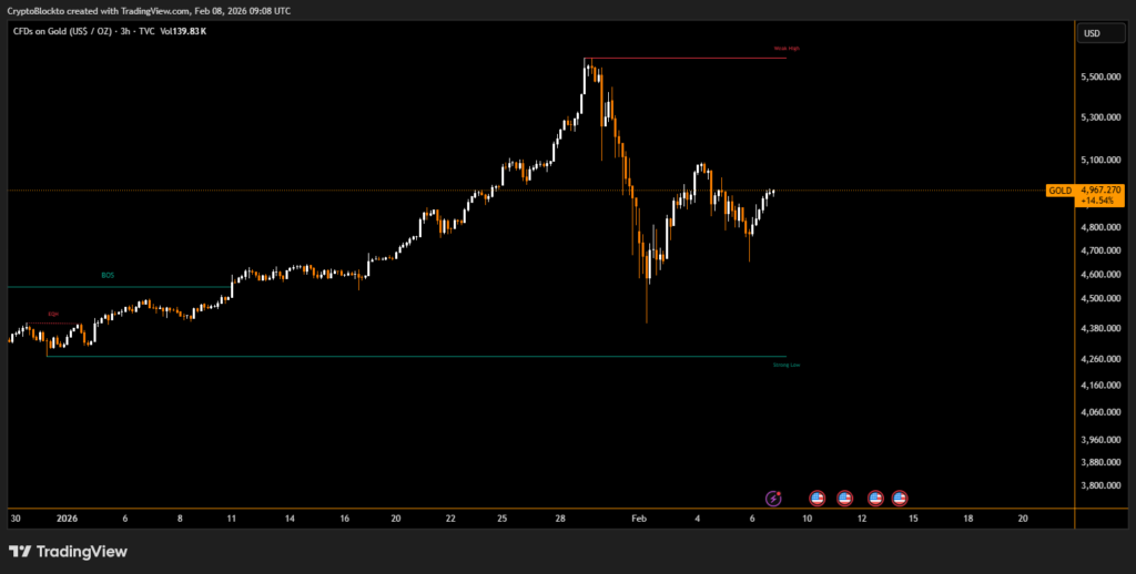 Gold joined risk assets in weakness, with prices breaking below psychological support levels. Technical analysis points to significant drops near major psychological levels, suggesting short-term bearish pressure in precious metals as traders repriced risk across markets.