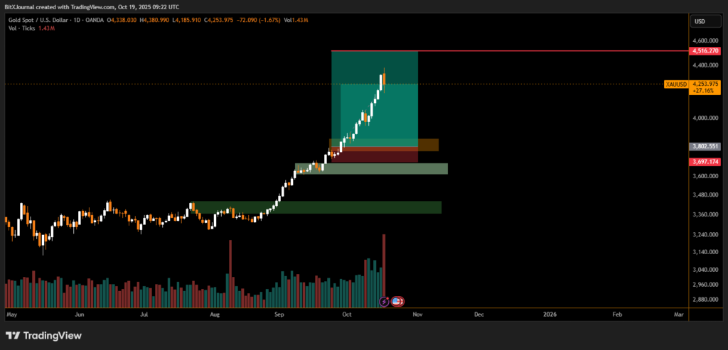 While crypto markets digested volatility, gold prices surged to record highs, briefly crossing $4,300 per ounce as investors rotated into defensive assets. Analysts cited growing expectations of U.S. interest-rate cuts and intensifying trade concerns as the main drivers.
