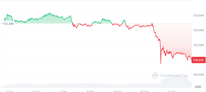 Bitcoin plunged more than 10% within 24 hours, briefly dipping to $102,000 on major exchanges, while Ethereum and other altcoins followed with double-digit losses. At the time of writing, Bitcoin trades near $110,000, marking a 7-day drop of over 10%.