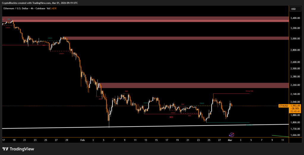 Ethereum underperformed BTC for much of the week, dipping below $1,900 as risk aversion intensified. Geopolitical reports triggered a roughly 3% intraday drop at one point, reflecting broad market selling rather than any protocol specific weakness.