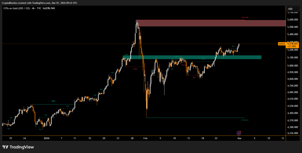 Gold continued to outperform trading near $5278 as risk assets amid intensifying geopolitical tensions. Substantial gains for gold prices in late February as investors sought refuge from equity and crypto market stress, with precious metals rallying while BTC and other risk instruments declined.