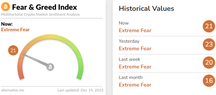 The cryptocurrency market continues to struggle with weak sentiment as the Cryptocurrency Fear and Greed Index dropped to 21 on December 14, down from 23 a day earlier. The decline keeps the market firmly in the “extreme fear” zone, reflecting persistent uncertainty among investors despite recent price stabilization in major digital assets.