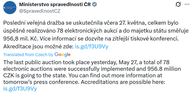 On May 28, the Czech Ministry of Justice revealed it had raised nearly 1 billion CZK (~$45M) by auctioning 500 Bitcoin donated by Jirikovsky. The ministry planned to allocate the proceeds to initiatives like digitizing the justice system, combatting drug use in prisons, and improving staff housing.