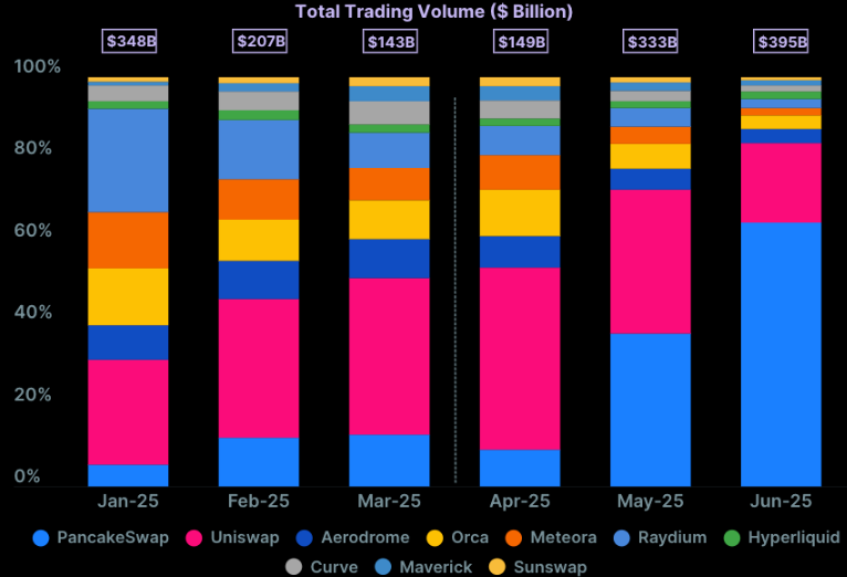 One of the major contributors to DEX momentum was PancakeSwap, operating on the Binance Smart Chain (BSC). Its trading volume soared 539% in Q2, reaching $392.6 billion, up from just $61.4 billion in Q1.