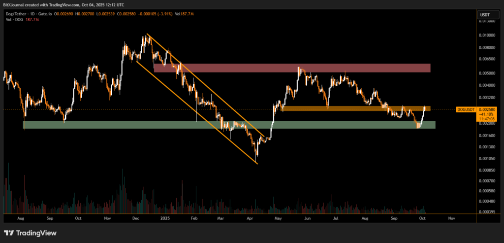 The Dog Token (DOGUSDT) has staged an impressive rebound after testing its critical demand zone, rising to $0.00258 at press time. The token’s recovery comes following weeks of sustained selling pressure, with the market now eyeing a decisive move above immediate resistance levels.