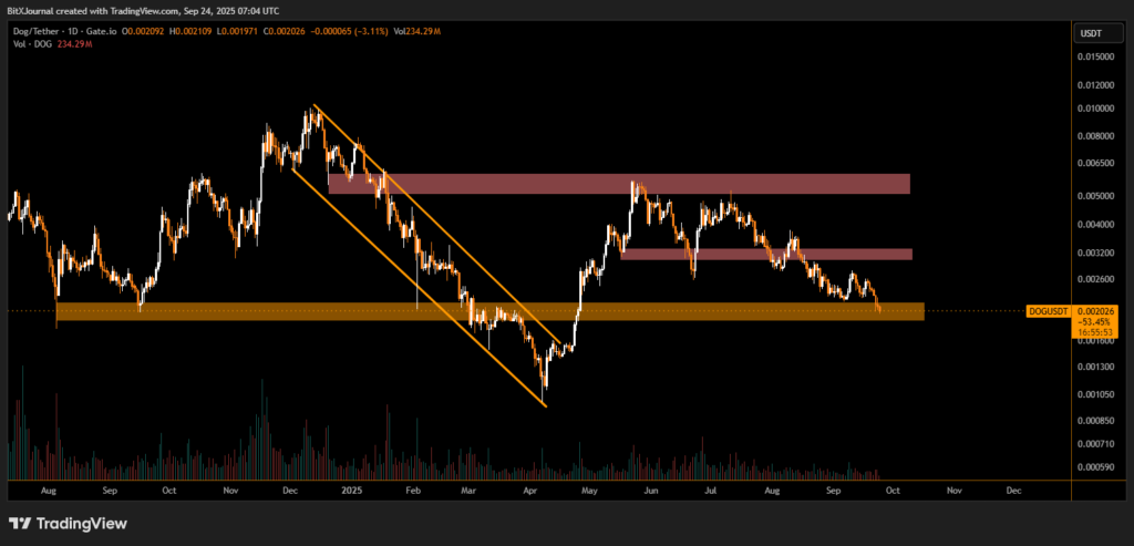 On the daily chart, DOG has been in a prolonged downtrend, breaking through several resistance levels before stabilizing in the highlighted orange support area. The current structure shows that while sellers maintain pressure, buyers are still defending the $0.0020 mark, preventing further breakdown for now.