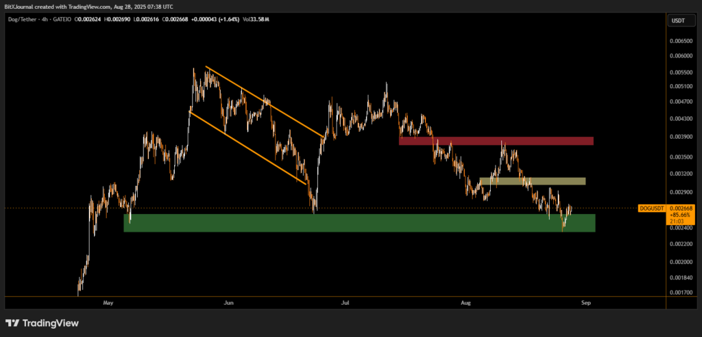 On the upside, immediate resistance lies at $0.0029–$0.0030, followed by the stronger supply wall around $0.0035–$0.0039. Without a decisive breakout above these levels, the broader trend is likely to remain bearish.