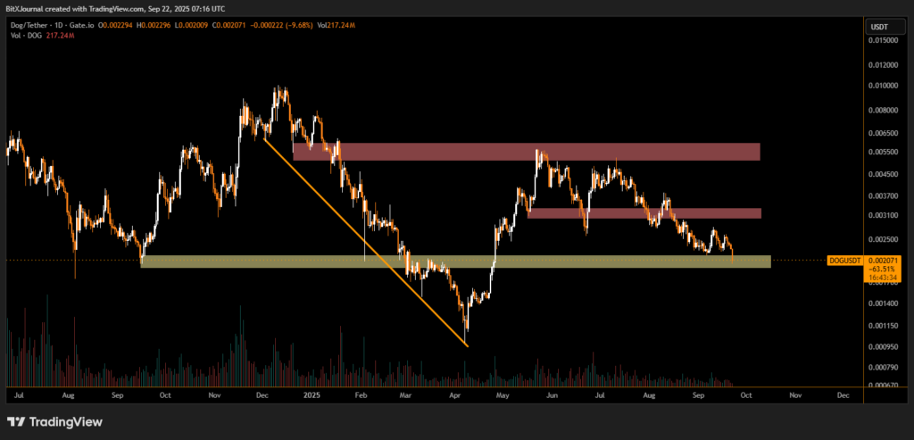 The daily chart shows DOGE testing its long-standing demand area between $0.00195 and $0.00210, a level that has repeatedly halted sharp declines since mid-2024. This region is now seen as a critical pivot point for market participants.