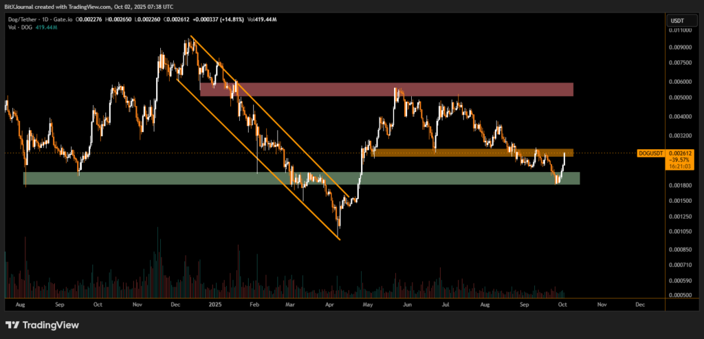 While DOGE has recovered sharply, analysts caution against assuming a straight-line rally. Sustaining above $0.00250 is crucial to confirm bullish continuation. A failure to hold these levels could see DOGE revisiting the lower green demand zone.