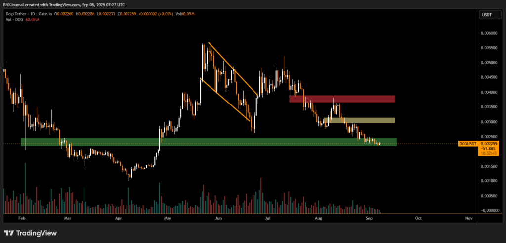 The daily chart highlights a critical green support area around $0.0022, where price has repeatedly found a base over recent sessions. This zone coincides with the same level that provided a springboard for May’s rally, indicating its importance as a structural demand level.
