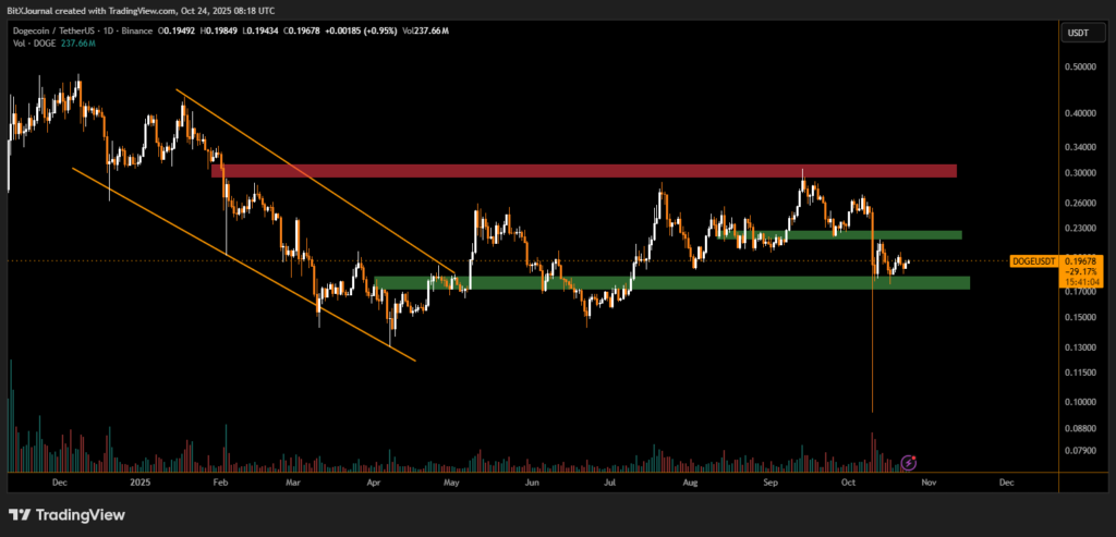 If confirmed, the next resistance zone lies between $0.26 and $0.30, where previous rallies have stalled. A breakout beyond this level could reignite speculation of a wider altcoin recovery. Conversely, losing the $0.17 support could invalidate the Wyckoff structure, returning DOGE to its prior range lows.