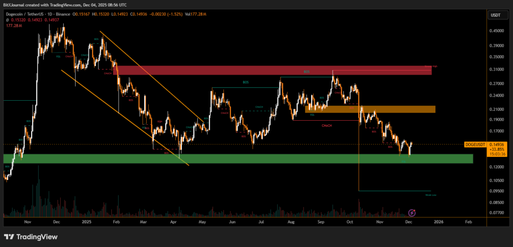 Above this level, Dogecoin’s next technical objective sits at the $0.1530 target, a zone that aligns with prior consolidation and the upper boundary of the recent corrective phase. A sustained move beyond this point could shift the broader trend, opening the door toward higher resistance zones seen earlier in the cycle.