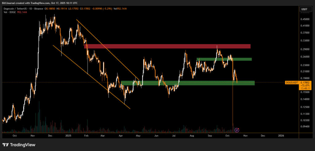 Technical indicators suggest DOGE is retesting the $0.17–$0.19 support zone, an area that has historically provided stability during prior corrections. The chart shows a steep pullback from the $0.26 resistance range, where price rejection triggered a sharp downward move.