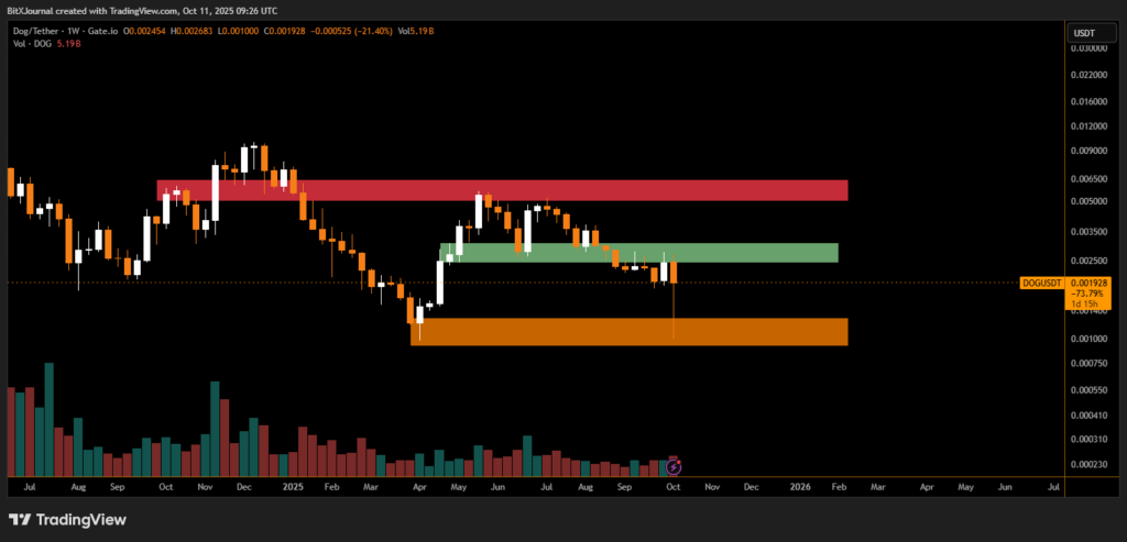 Dog coin has experienced a significant technical breakdown this week, plummeting approximately 21.16% in value according to weekly chart data. The asset, which is now testing critical support levels, saw its price fall to $0.000519 amid a broader market downturn that has investors closely monitoring key technical indicators.