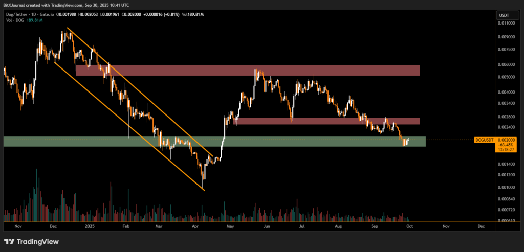 Dogecoin (DOGE) is clinging to a crucial support zone, holding above its 200-day moving average (200DMA) after weeks of downward pressure. The popular meme-inspired cryptocurrency is trading around $0.0020, stabilizing in a green demand zone that has historically acted as a turning point for price action.