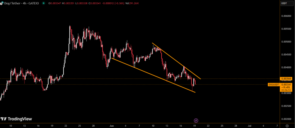The current chart pattern hints at a descending triangle, traditionally a bearish structure. However, the recent volume contraction could also suggest that DOGE is stabilizing before a larger move.