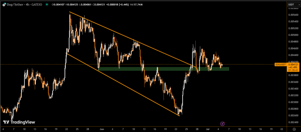 On July 5, Dogecoin experienced a steep decline from $0.170 to $0.161, closing the day near $0.163 — a 5.36% loss. However, the decline was met with significant buying activity at the $0.162 level, where trading volume exceeded 452 million DOGE, more than double the daily average.