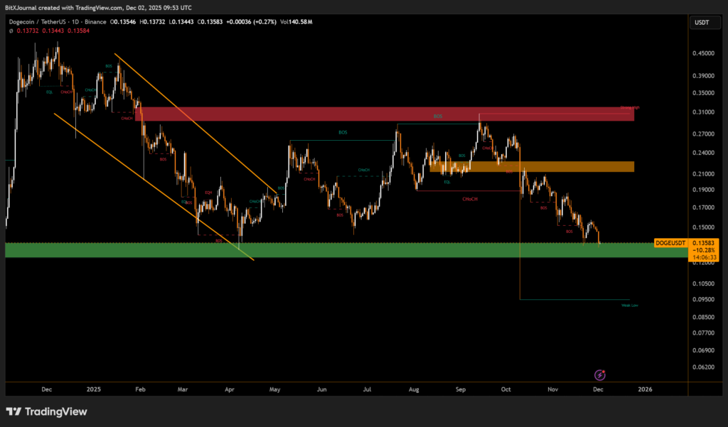 For Dogecoin to regain upward traction, price needs to reclaim the resistance band between $0.1362 and $0.1386. A decisive close above this range would invalidate recent bearish impulses and open the door toward mid-range targets observed earlier in the quarter. Failure to retake this zone, however, increases the probability of retesting lower liquidity levels, with the next major downside interest clustered below $0.12.