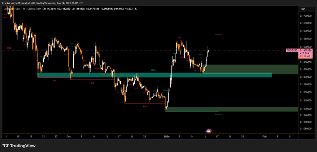 DOGE climbed from the mid-$0.13 area and decisively pushed above a descending trendline that had rejected multiple recovery attempts throughout December. The $0.138–$0.140 zone, previously acting as resistance, has now turned into an important support area. Price action shows buyers stepping in on pullbacks, suggesting growing confidence at higher levels.