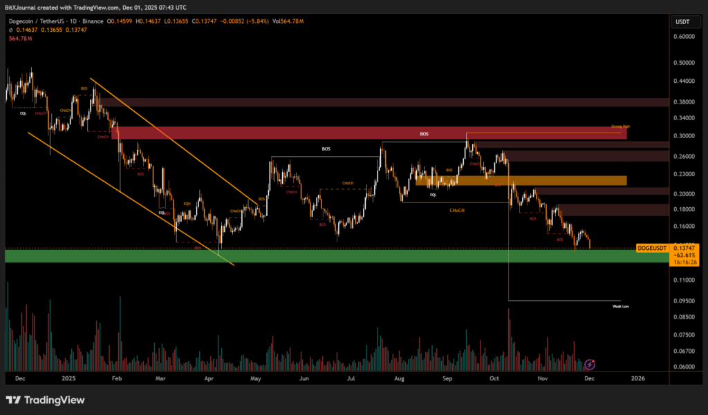If Bitcoin’s weakness continues, analysts caution that DOGE could revisit its lower liquidity areas, where buyers have historically stepped in.