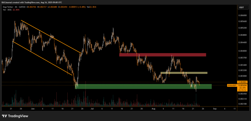The 4-hour chart shows a prolonged bearish trend, with DOGE consistently forming lower highs and lower lows since late July. After failing to break the resistance near $0.0037 (highlighted in red), sellers regained control, pushing the price below the minor support around $0.0031 (yellow zone) and now testing the major demand zone near $0.0026 (green zone).