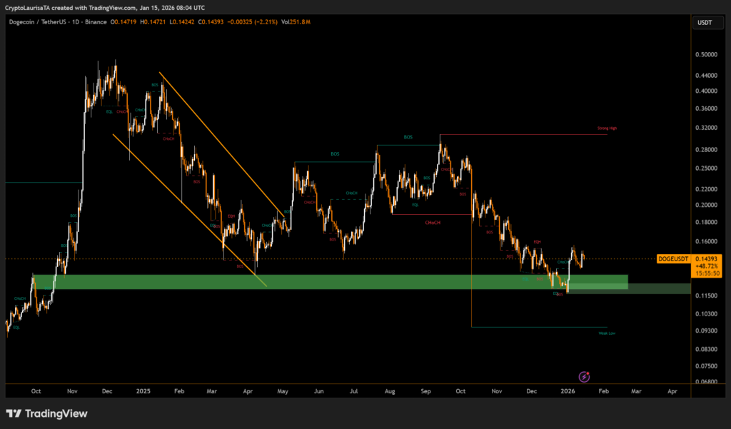 Dogecoin declined nearly 4% to $0.1426, as traders sold into short-lived rallies, signaling weakening momentum. The pullback unfolded even as broader crypto markets remained relatively stable, underscoring Dogecoin’s recent underperformance.