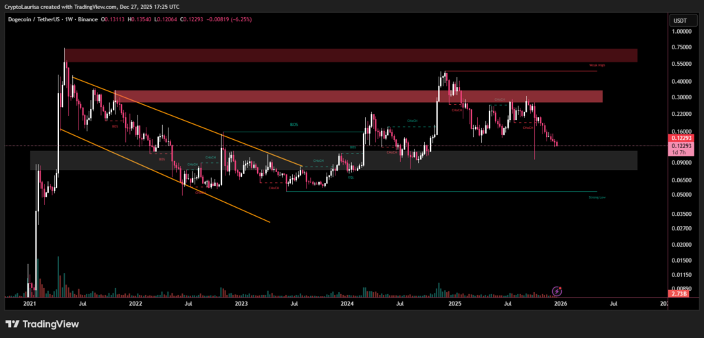 Recent DOGE price action shows persistent selling pressure, with rallies failing to attract sustained follow-through. This weakness aligns with broader market conditions, where large-cap cryptocurrencies remain range-bound and directional conviction is limited. As volatility compresses in major assets, speculative tokens like Dogecoin tend to experience outsized downside moves.