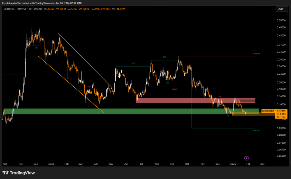To the upside, DOGE must reclaim and hold above $0.1243 to ease immediate pressure. A sustained move higher would allow for a retest of $0.1255, the prior intraday high.