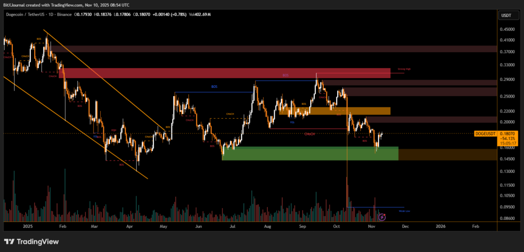 On the technical side, Dogecoin is attempting to reclaim its support range near $0.175–$0.185, after rebounding strongly from a major demand zone around $0.16. Price action shows a break of structure (BOS) on the daily chart, indicating a potential short-term trend reversal.