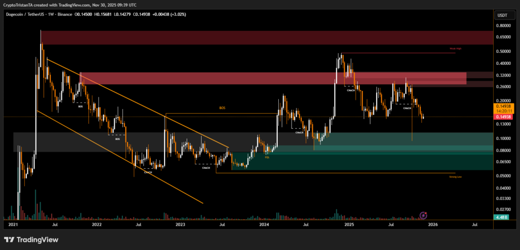 DOGE’s weekly structure remains neutral-to-bearish until buyers regain momentum above the first supply layer. A decisive weekly close over the $0.20–$0.26 region would significantly strengthen bullish continuation potential.