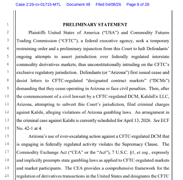 CFTC, DOJ court filing seeking a TRO against Arizona federal court in case against Kalshi,