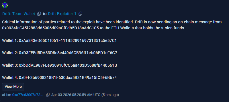 Drift Protocol, a Solana based decentralized exchange, has initiated onchain communication with wallets tied to a major exploit estimated between $280 million and $286 million. The protocol confirmed that messages were sent from its Ethereum address to four wallets believed to hold stolen Ether, urging the attacker to establish contact through Blockscan chat.