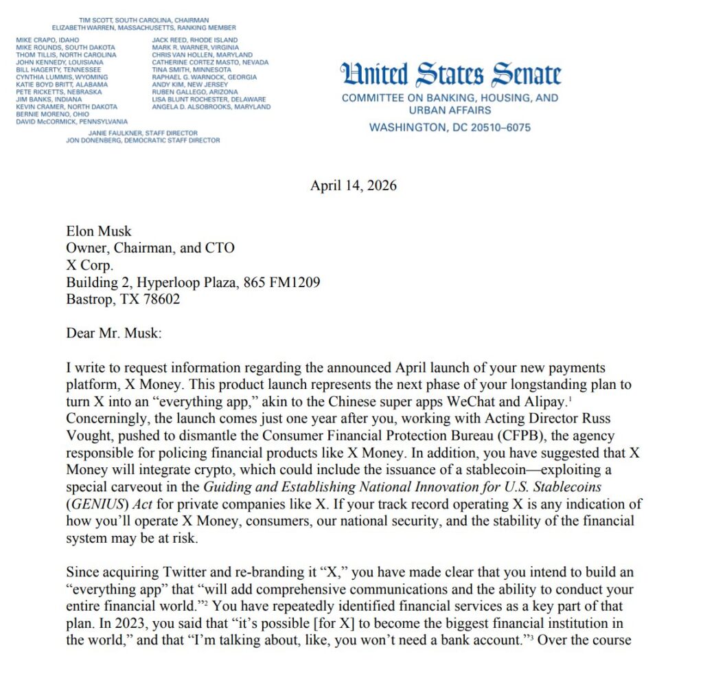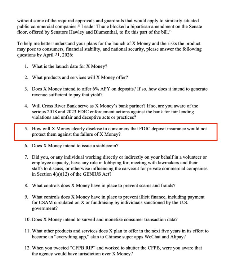 Elizabeth Warren’s letter seeking information about the upcoming X Money launch