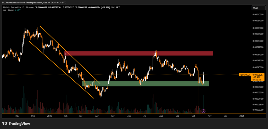 Shortly after the post, Floki (FLOKI) jumped from $0.00006572 to $0.00008469 — a rise of nearly 28.8%, according to CoinGecko. At press time, the token had slightly corrected to $0.00007998.