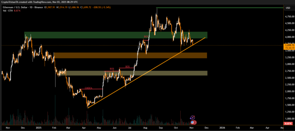 Ethereum (ETH) slipped below the $3,700 mark, falling by 5.34% in the past 24 hours as selling pressure intensified across the broader crypto market. The decline tested the lower boundary of the ongoing ascending trendline, which has guided Ethereum’s uptrend since early April.