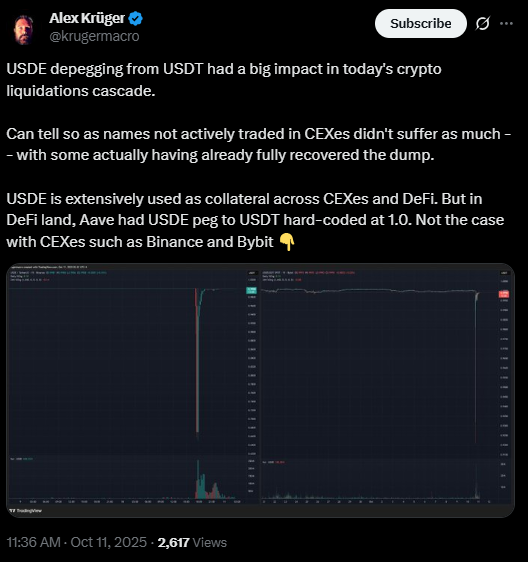 Analysts like Alex Krüger noted that the fallout highlighted how price feeds differ across exchanges, with decentralized protocols like Aave being partially insulated due to hardcoded $1 pricing.