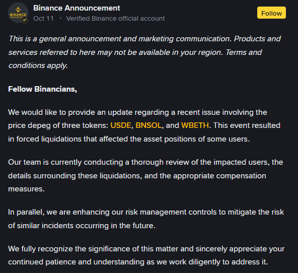 Ethena Labs emphasized in a statement that USDe remained overcollateralized, with no interruption to its protocol’s core functions. The team explained that the rapid depeg was primarily a secondary market effect caused by extreme liquidations, not a failure in the protocol itself.
