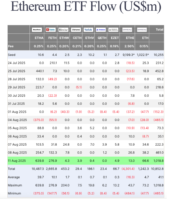 The bulk of the investment went to BlackRock’s iShares Ethereum Trust (ETHA), which attracted a record $640 million. The Fidelity Ethereum Fund (FETH) followed closely, adding $277 million, marking its own largest single-day inflow.