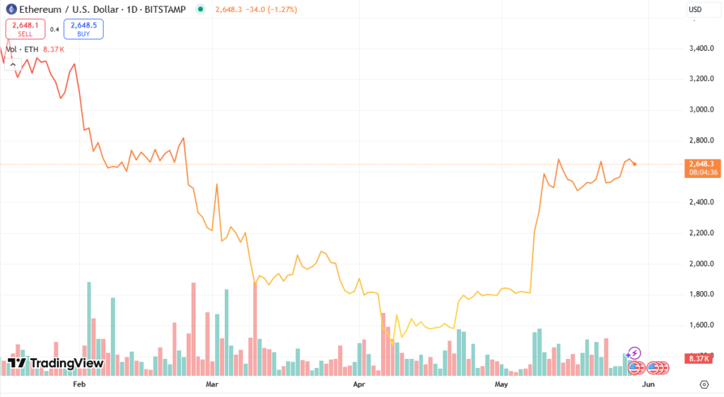 A major driving force behind Ether’s recent momentum is institutional demand. According to market analysts, record-breaking inflows into spot ETH ETFs have ignited buying pressure. This growing interest has helped ETH rebound from a low of $1,472 in April to its current price of $2,651.