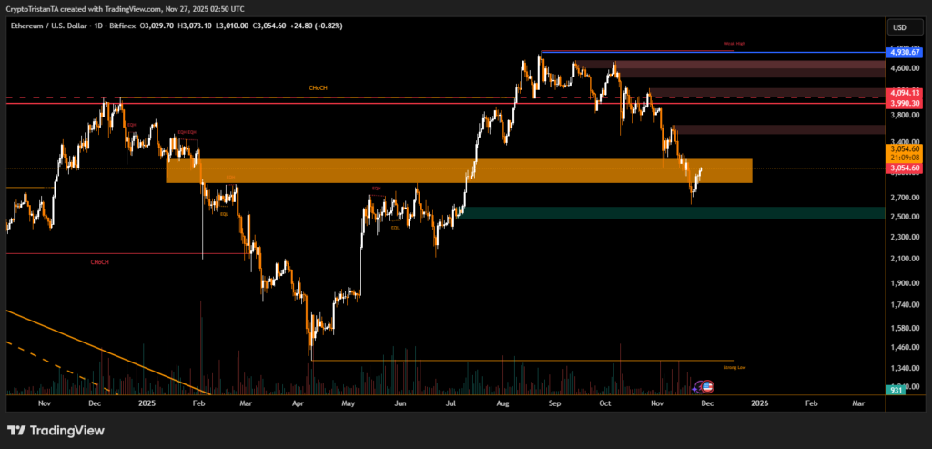 The provided chart shows Ethereum tapping into a large orange demand block, a region where price previously accumulated before rallying toward yearly highs. After touching the lower boundary of this zone, ETH quickly bounced, reclaiming the $3,000 handle in decisive fashion.