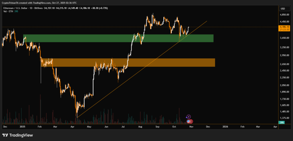 The daily chart shows Ethereum maintaining a clear ascending trendline that has supported price action since April 2025. Each dip toward this line has attracted heavy buying pressure, suggesting strong conviction among traders. The recent rebound from the green demand zone near $3,700 confirms that buyers continue to dominate the market.