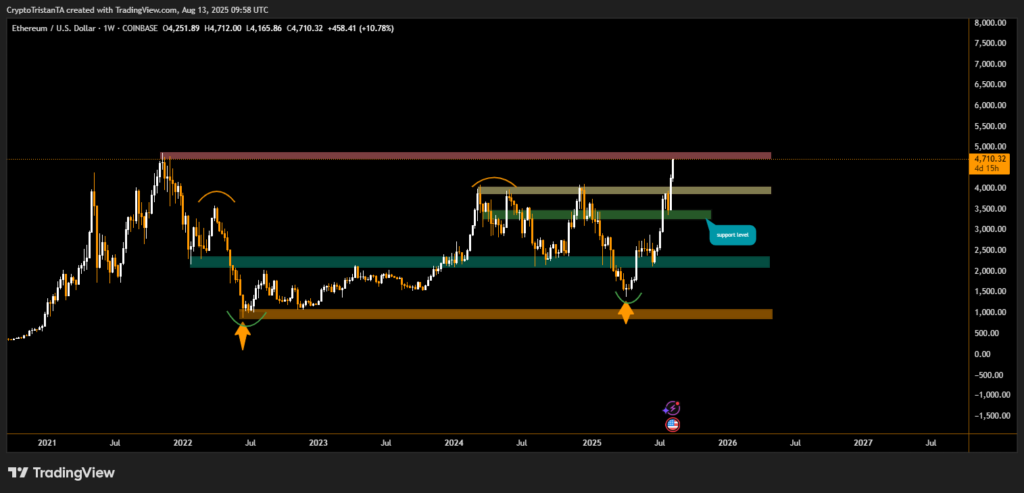 The weekly chart shows ETH forming a double-bottom reversal pattern from its $880–$1,000 support zone, followed by a series of higher highs and higher lows. The breakout above the $3,600 resistance band in recent weeks paved the way for the current rally toward the macro resistance zone.