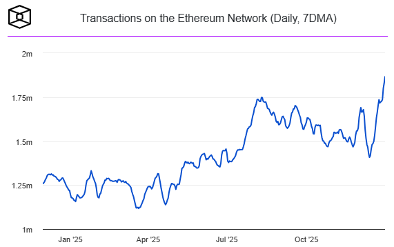 On Dec. 31, Ethereum’s seven-day moving average of daily transactions climbed to 1.87 million, exceeding the prior record of 1.61 million in May 2021 and surpassing the 1.73 million high recorded in August 2025. This data confirms that current network demand is stronger than during the height of NFT speculation.