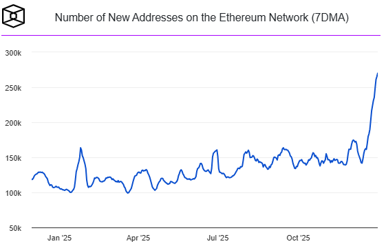 At the same time, active addresses rose to 728,904, the highest level since mid-2021, while 270,160 new addresses were created in a single day, marking the largest daily increase since early 2018. These figures point to both renewed user engagement and fresh onboarding.