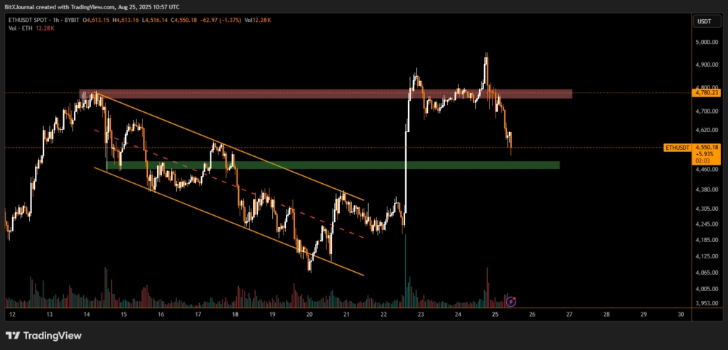 The recent chart pattern shows ETH breaking out of a descending channel before rallying sharply toward $4,780, where it faced significant supply pressure. This zone now acts as a major resistance level, with sellers dominating above $4,750.