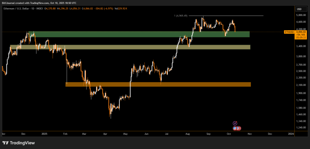 According to daily chart data, Ethereum is retesting the major support zone between $4,000 and $4,150, highlighted by the green area. This level coincides with a prior breakout region that fueled the last upward surge toward $4,969, the most recent swing high.