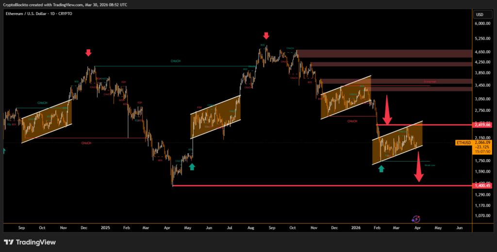 Ethereum’s native token, Ether (ETH), could drop to $1,200 in the coming weeks, following a fractal setup identified by analyst Leshka.eth. The warning stems from a Supertrend pattern on the daily chart, where previous bullish flips in October 2025 and January 2026 failed and preceded 45% and 48% declines. Currently, ETH is showing a similar setup around $1,990, with the next downside target at $1,200 if support breaks.