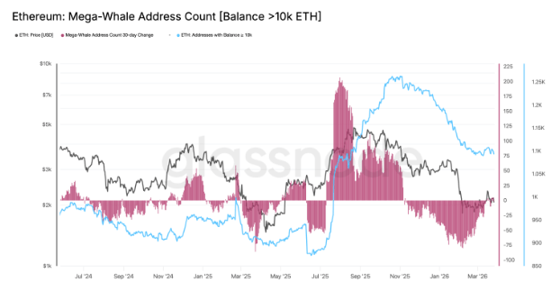 Data from Glassnode indicates limited accumulation by major ETH holders. Mega-whale wallets with over 10,000 ETH have plateaued since late 2025, and mid-sized wallets holding 1,000–10,000 ETH show little renewed buying. Smaller holders, or “shark” addresses with 100–1,000 ETH, also remain below last year’s peaks, suggesting broad-based demand is low.