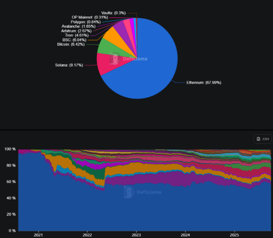Despite rising competition from other blockchains, Ethereum continues to dominate DeFi. The network accounts for about 68% of total value locked (TVL) across DeFi platforms, according to DefiLlama. While this is a decline from its 2021 peak, Ethereum remains the leading platform for decentralized finance.